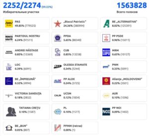 След преброяване на 99% от гласовете, управляващата партия „Действие и солидарност“ на Мая Санду губи десет места, но запазва мнозинството си, съобщава Централната избирателна комисия.