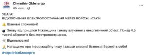 „Русия атакува енергиен обект в района Нежин в Черниговска област. Повече от 4500 абонати останаха без електричество“, съобщи украинската регионална енергийна компания.
