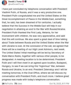 „Ние се договорихме за среща на нашите високопоставени съветници следващата седмица. Държавният секретар Марко Рубио ще ръководи първоначалните срещи, заедно с редица други, които ще бъдат определени. Мястото ще бъде определено по-късно. След това президентът Путин и аз ще се срещнем на предварително уговореното място в Будапеща, Унгария, за да обсъдим дали можем да сложим край на тази «безславна» война между Русия и Украйна“, написа Тръмп.
